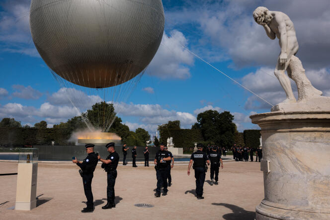 Des policiers français passent devant la vasque des Jeux olympiques et paralympiques attachée à un ballon transportant la flamme olympique dans le jardin des Tuileries à Paris,le 7 août 2024. JOEL SAGET / AFP Les deux écrans géants font vibrer le parvis de l’Hôtel de Ville de Paris,jeudi 8 août,en fin d’après-midi. L’un diffuse du basket masculin,l’autre du handball féminin – les deux équipes ont une chance d’envoyer la France en finale des Jeux olympiques (JO). Malgré la chaleur,plusieurs centaines de supporteurs sont déjà réunis sur la plus importante « zone de festivité » de la capitale,baptisée la « Terrasse des Jeux »,d’une capacité de 12 000 personnes.