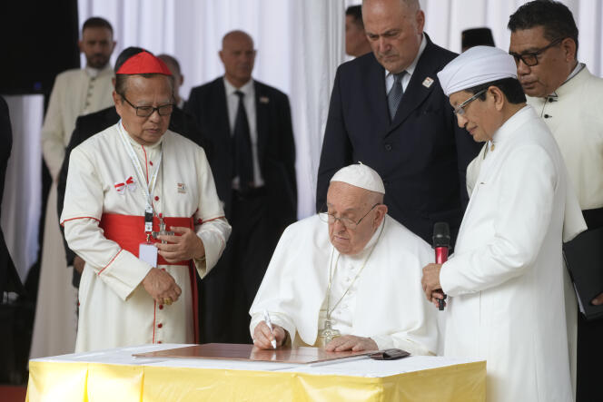 Le pape François,accompagné de l’archevêque de Djakarta,le cardinal Ignatius Suharyo Hardjoatmodjo,à gauche,et du grand imam Nasaruddin Umar,à droite,signe une plaque commémorative de sa visite au « Tunnel de l’amitié » reliant la mosquée Istiqlal à la cathédrale Notre-Dame-de-l’Assomption à Djakarta,le jeudi 5 septembre 2024. GREGORIO BORGIA / AP Pourquoi le pape,âgé de 87 ans et à la santé fragile,tenait-il tant à ce voyage de douze jours à travers quatre pays d’Asie du Sud-Est ? Selon Michel Chambon,anthropologue et théologien catholique,les enjeux sont aussi religieux que politiques. Pour ce spécialiste du catholicisme en Asie,qu’il étudie depuis l’Université nationale de Singapour,cité-Etat où le souverain pontife doit se rendre du 11 au 13 septembre,François cherche à envoyer un message à la fois à son Eglise et aux grandes puissances mondiales,à commencer par la Chine.