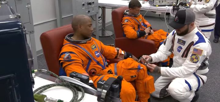 Les astronautes américains Victor Glover et Reid Wiseman s'équipent avant le décollage de la mission Artemis II,le 1er avril 2026. (NASA / YOUTUBE)
