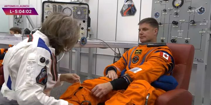 L'astronaute canadien Jeremy Hansen s'habille avant avant le départ de la mission Artemis II,le 1er avril 2026. (NASA / YOUTUBE)